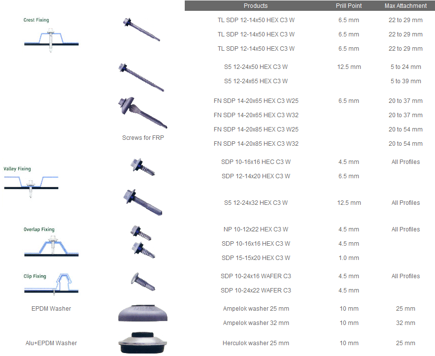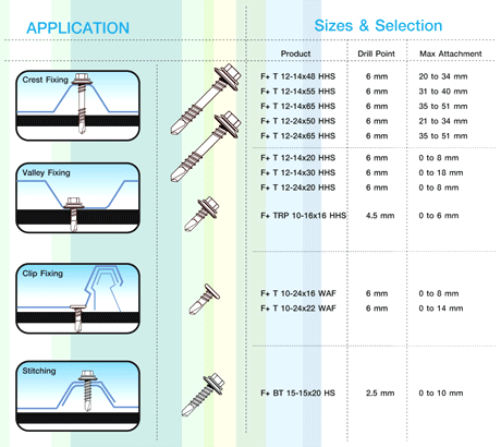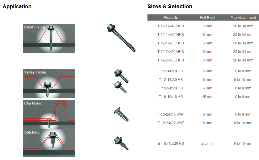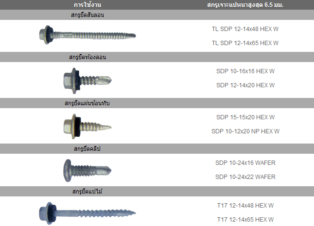 สกรูปปลายสว่าน ยึดกระเบื้องหลังคา ใช้ยึดแปสำเหร็จรูปกับจันทัน ที่มีความหนาไม่เกิน 3.2 มม.ด้วยสว่านไฟฟ้าโดยไม่ต้องเจาะรูนำ